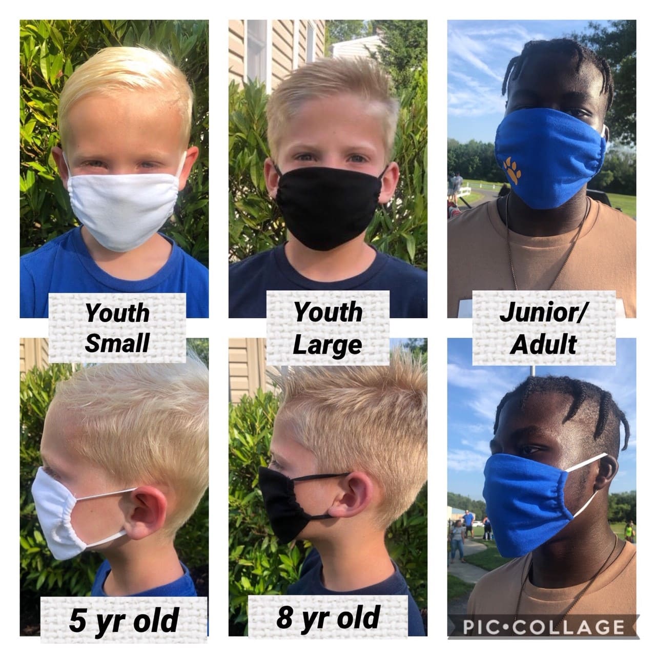 *Face masks comes in 3 sizes, youth small for young children, youth large for older children and Juniors/Adult for teens and adults. Children and their faces come in all different sizes. Please refer to the picture and see which size might be right for your child. Masks are a 2-ply 100% cotton material with a thin 1/8" elastic for comfort. Adult masks have an aluminum nose strip to help with fogging glasses.
